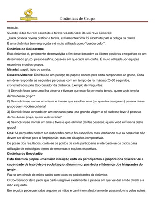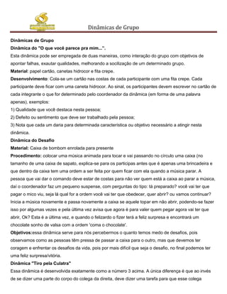 1) O documento apresenta várias dinâmicas de grupo, com objetivos de quebra de gelo, melhoria da socialização e observação de características dos participantes.