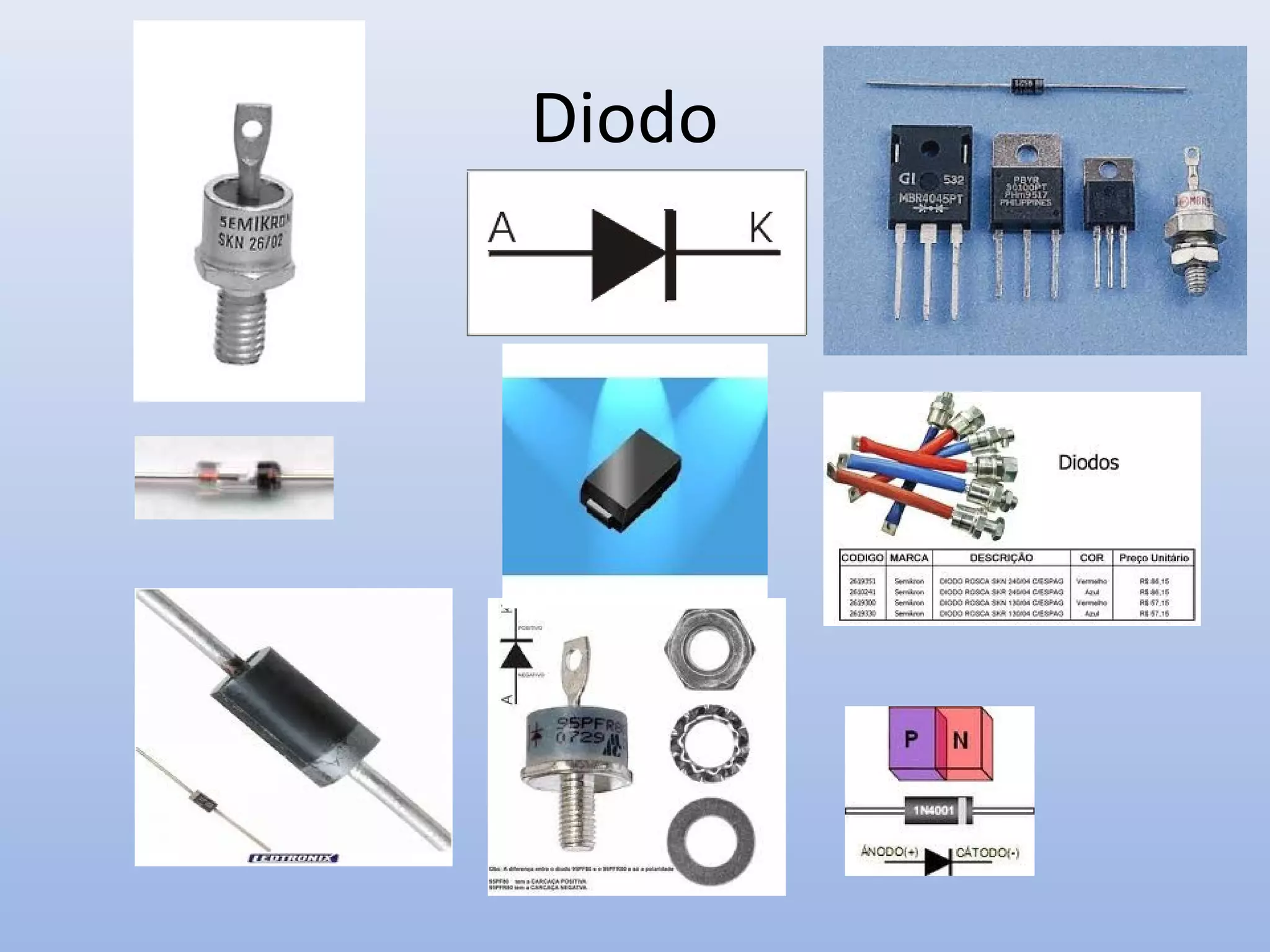 O documento descreve o funcionamento de diodos semicondutores, incluindo a formação da camada de depleção e como a polarização direta e inversa afetam a passagem de corrente. É explicado como diferentes tipos de diodos como Zener, Varicap, túnel, Schottky, LED e fotodíodo funcionam.