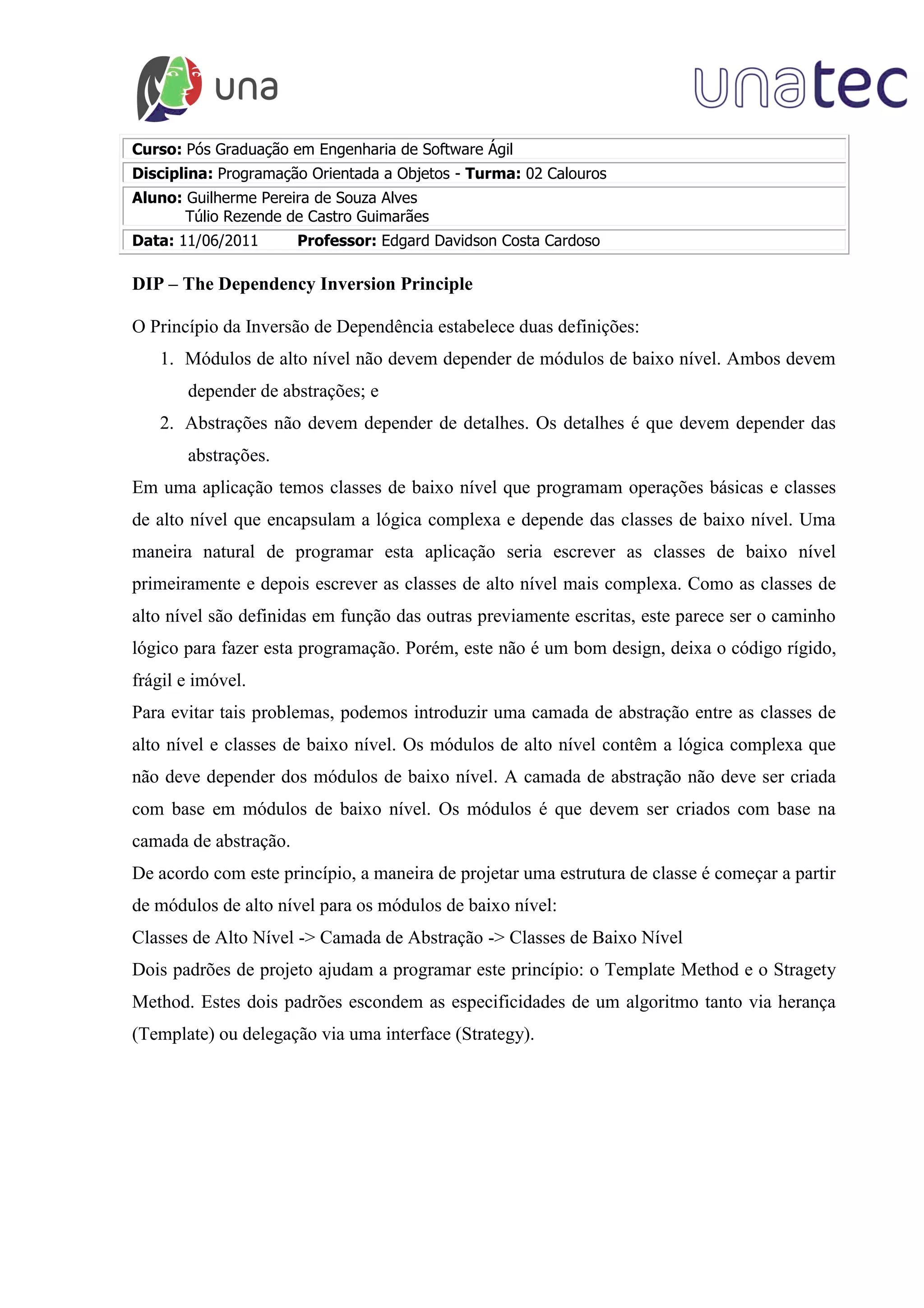 O documento discute o Princípio da Inversão de Dependência (DIP), que estabelece que módulos de alto nível não devem depender de módulos de baixo nível, mas sim de abstrações, e abstrações não devem depender de detalhes, mas sim os detalhes das abstrações. O documento apresenta um exemplo de cálculo de salário antes e depois da aplicação do DIP.