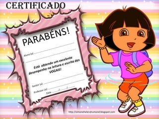 O documento contém certificados de desempenho em leitura e escrita de vogais e letras do alfabeto para serem preenchidos com os dados do aluno.