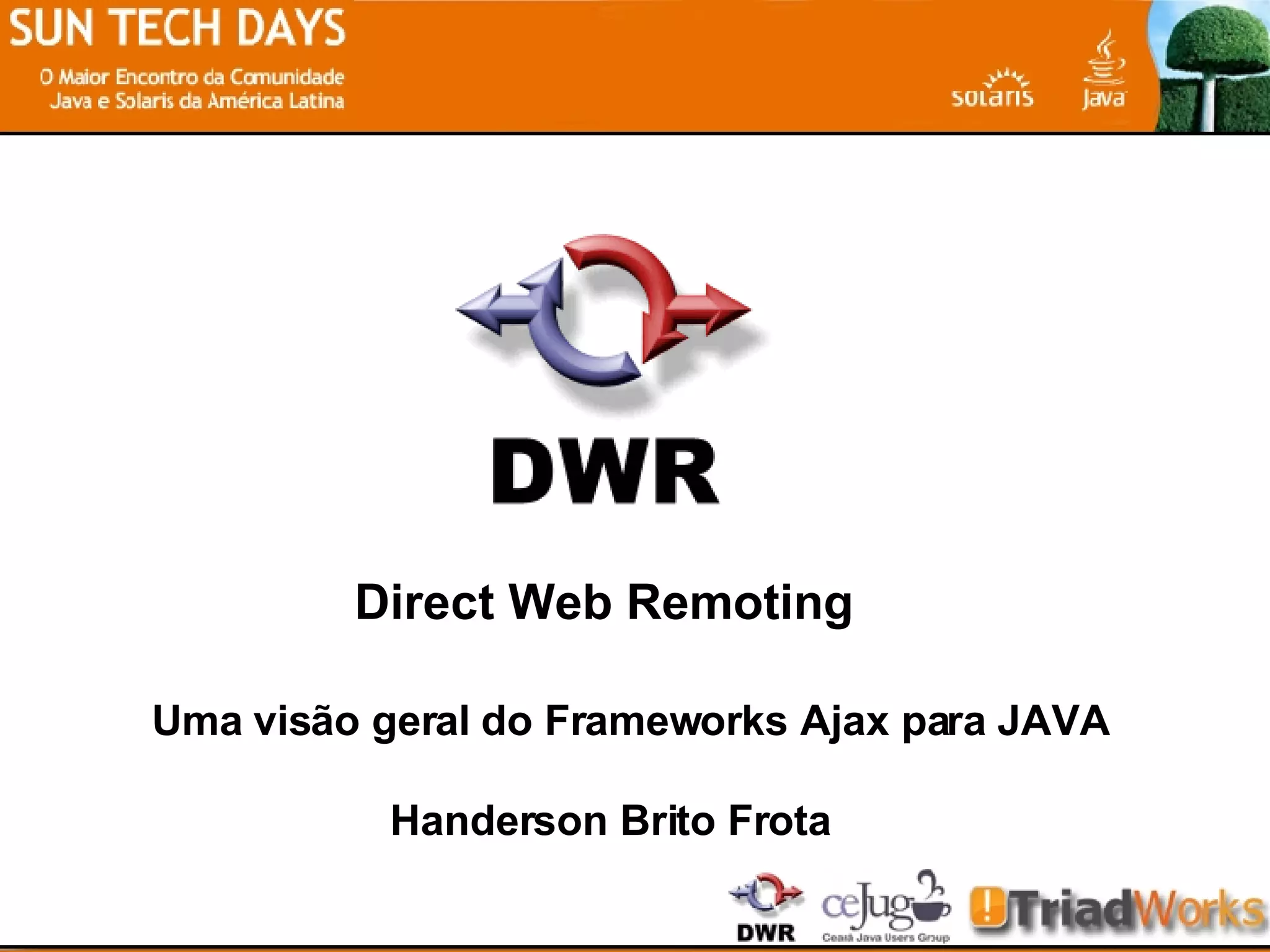 O documento fornece uma visão geral do Direct Web Remoting (DWR), um framework Ajax para Java. DWR facilita o desenvolvimento de sites web com Ajax, permitindo acesso remoto às classes Java com simplicidade e integração com tecnologias como Servlets, Spring e Struts. O framework oferece características como fácil configuração, suporte a segurança padrão Java EE e componentes para interface gráfica.