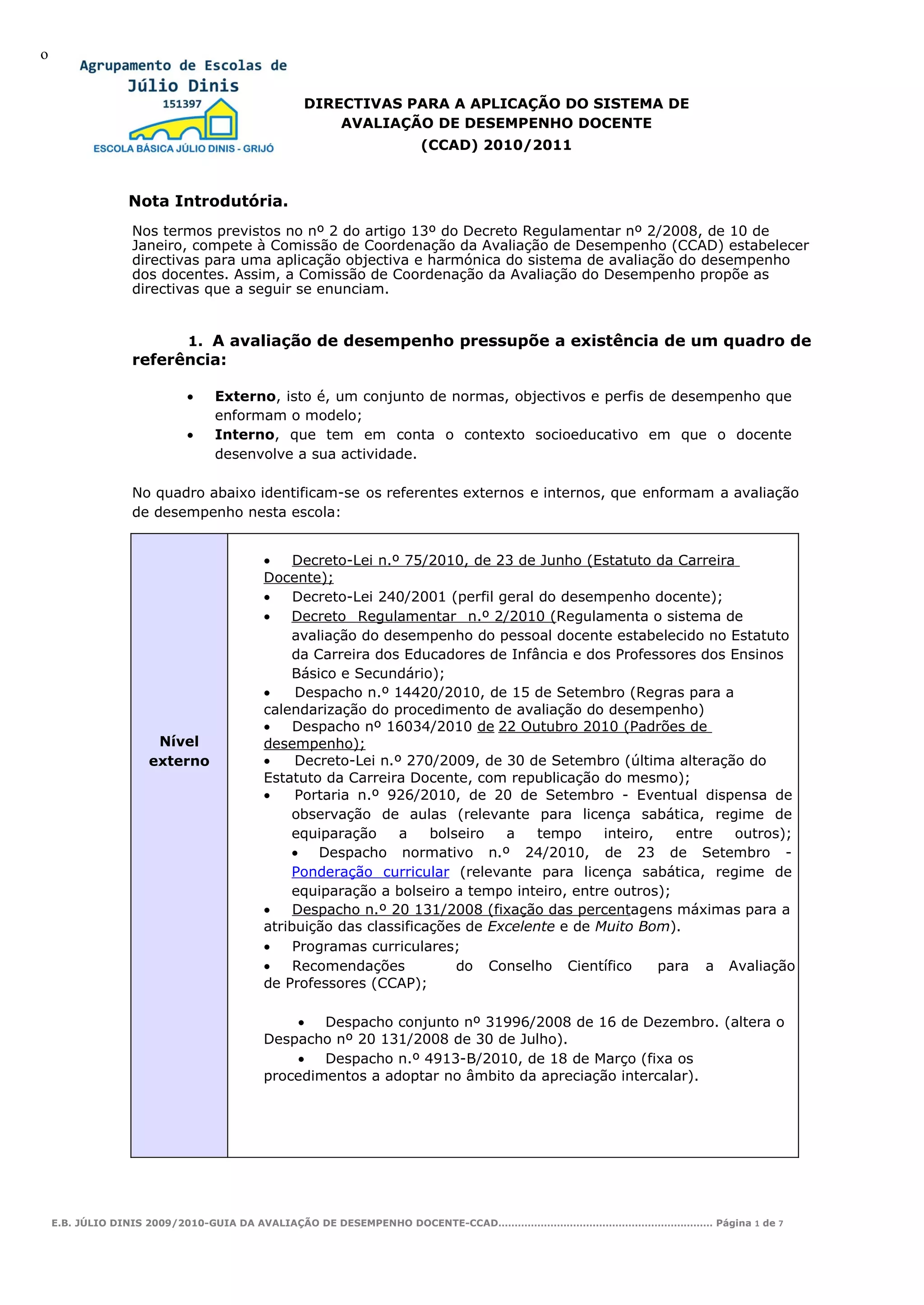 Escola Básica Júlio Dinis 2010/2011-Directivas para a Avaliação de Desempenho Docente - CCAD……………………………………………… Página 7 de 7