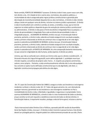 O documento discute o direito à vida de acordo com vários autores e documentos legais. Pontes de Miranda define o direito à vida como inato e inerente à pessoa humana. Alexandre de Moraes afirma que a Constituição assegura o direito à vida em sua dupla acepção: o direito de continuar vivo e o direito de ter uma vida digna quanto à subsistência. O documento também discute a definição de dignidade e como ela está ligada ao conceito constitucional de vida.