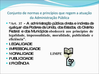 O documento descreve os principais princípios e poderes da administração pública brasileira, como a legalidade, impessoalidade, moralidade, publicidade, eficiência, supremacia do interesse público, indisponibilidade, finalidade, motivação, razoabilidade, ampla defesa e poderes como vinculado, discricionário, hierárquico, disciplinar, regulamentar e de polícia.