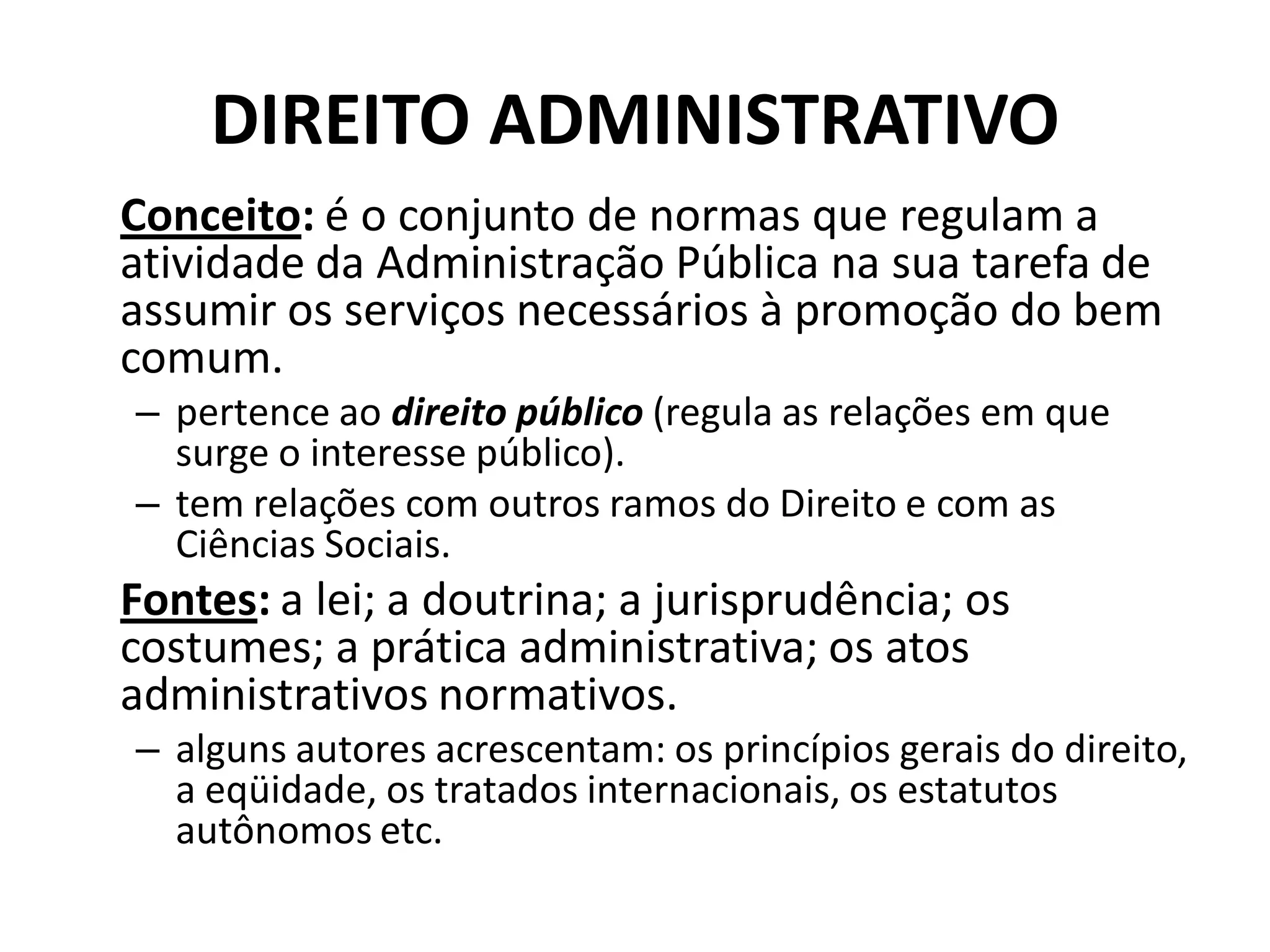 O documento descreve os conceitos fundamentais do Direito Administrativo brasileiro, incluindo sua definição, fontes, características, princípios e sistemas de controle da administração pública. Também aborda os conceitos de administração pública direta e indireta e as diferentes formas de prestação de serviços públicos.