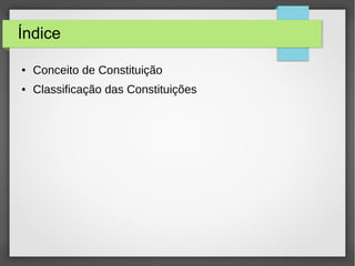 O documento discute conceitos de constituição e classificações de constituições. Apresenta três conceitos de constituição: sociológico, político e jurídico. Também classifica constituições de acordo com conteúdo, forma, origem, estabilidade, finalidade e extensão.
