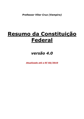 O documento apresenta um resumo da Constituição Federal elaborado por Vítor Cruz, professor de Direito Constitucional. O resumo é gratuito e foi feito com o objetivo de servir como material de revisão para concursos públicos. É dividido em tópicos que resumem os principais pontos da Constituição de forma concisa.