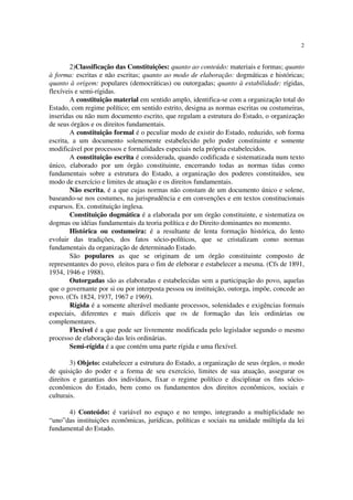 Este documento resume os principais conceitos do Direito Constitucional brasileiro, incluindo: 1) a definição de Direito Constitucional e Constituição; 2) as classificações de Constituições; 3) os elementos e objetivos de uma Constituição. Também discute a supremacia da Constituição e os sistemas de controle de constitucionalidade no Brasil.
