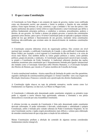 O documento fornece uma introdução sobre o Direito Constitucional, discutindo o que é uma Constituição e Direito Constitucional, a história e classificações das Constituições. Também resume a Constituição Brasileira de 1988, incluindo suas características, estrutura e emendas, além de artigos importantes e questões para fixação do assunto.