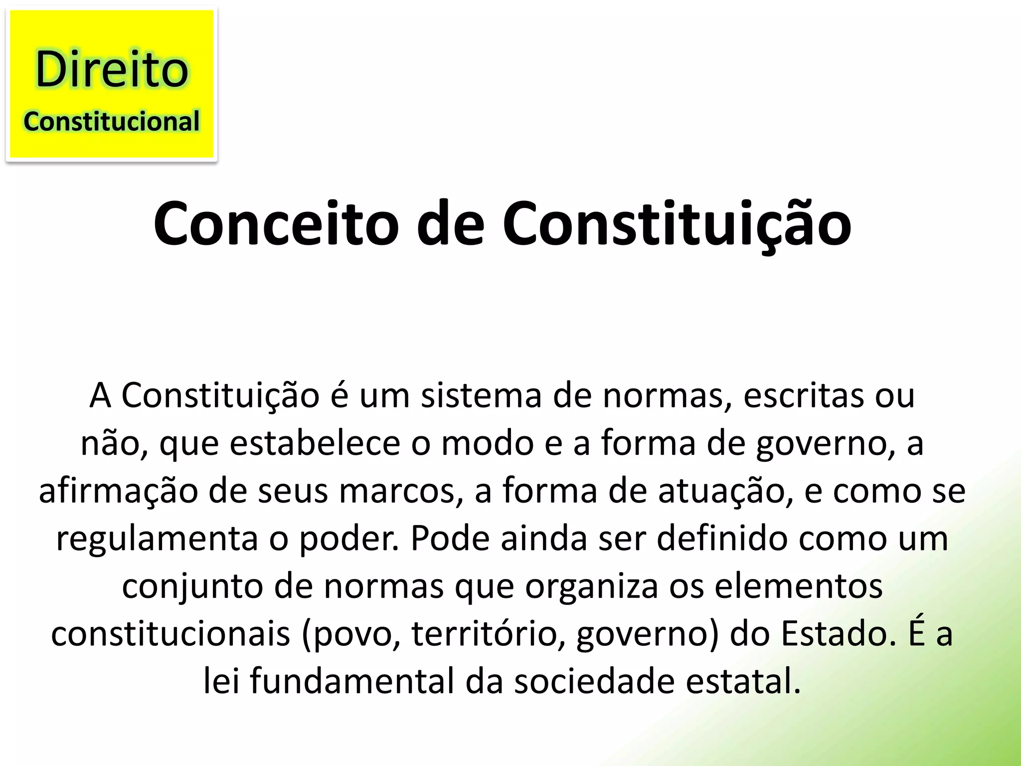 O documento discute conceitos de constituição e poder constituinte. Apresenta diferentes classificações de constituições de acordo com sua forma, origem e mutabilidade. Discute também a eficácia de normas constitucionais e como elas podem ser autoexecutáveis ou depender de legislação complementar.