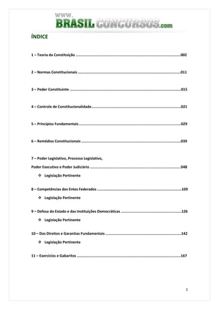 O documento discute a teoria da constituição, classificando-a em três acepções: sociológica, jurídica e política. Também classifica as constituições quanto ao conteúdo, estabilidade e forma. A constituição pode ser formal ou material, rígida ou flexível, escrita ou não escrita.