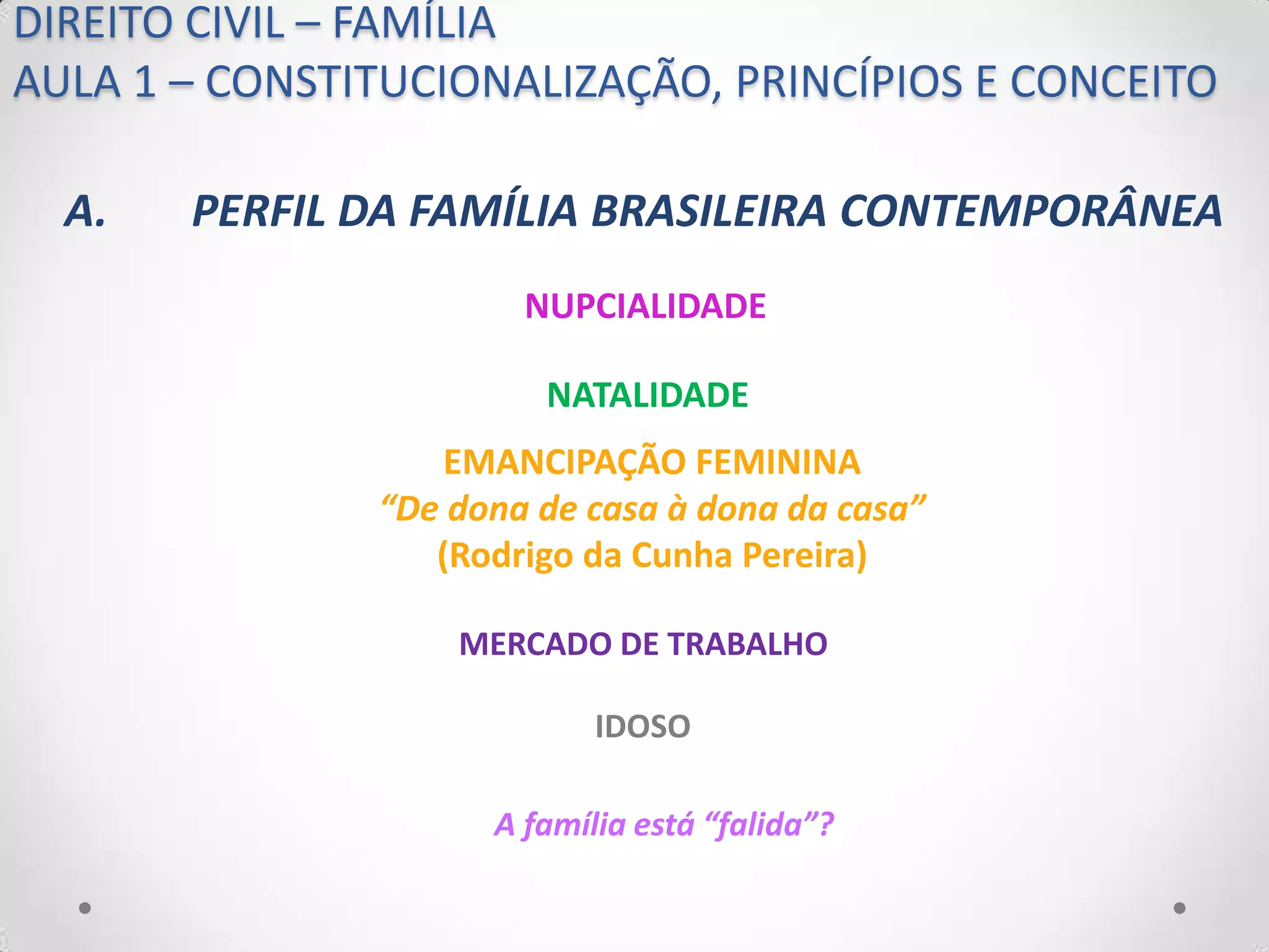 O documento discute a família brasileira contemporânea, a constitucionalização do Direito de Família e os principais princípios e conceitos da área. Aborda a nupcialidade, natalidade e emancipação feminina, além de tratar da dignidade humana, pluralidade de arranjos familiares e igualdade de direitos.