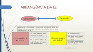 Este documento discute os conceitos fundamentais da Lei do Consumidor no Brasil. Resume que o consumidor é qualquer pessoa física ou jurídica que adquire produtos ou serviços, enquanto o fornecedor é quem produz, constrói ou distribui esses itens. Também destaca a obrigação dos fornecedores de fornecer informações verdadeiras e completas sobre os produtos e serviços oferecidos.