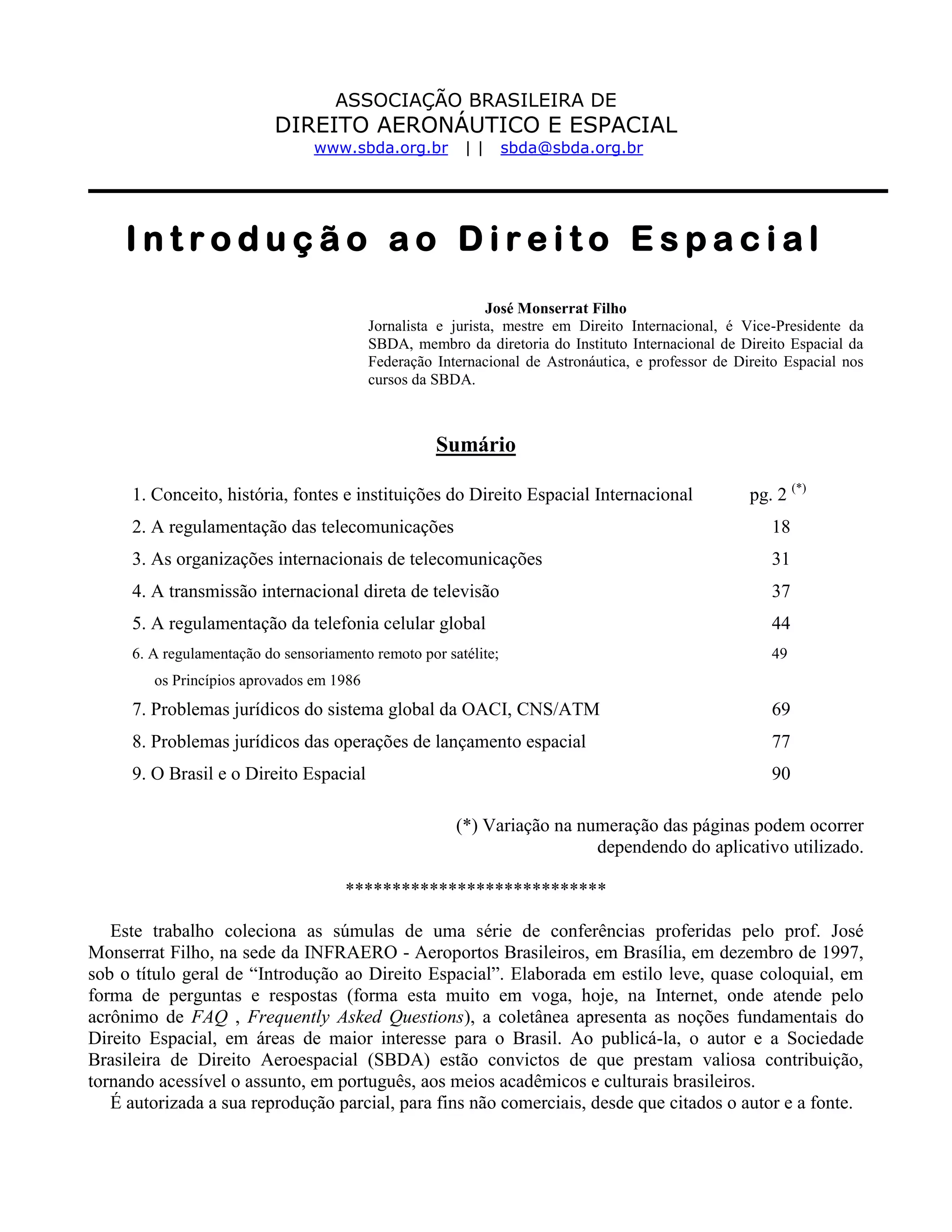 1. O documento discute a introdução ao Direito Espacial Internacional, incluindo sua história, conceito, fontes e instituições. 2. A Organização das Nações Unidas e a União Internacional de Telecomunicações desempenham papéis importantes na regulamentação das atividades espaciais. 3. Estudos sobre Direito Espacial ocorreram antes da Era Espacial em 1957, mas o Tratado do Espaço de 1967 estabeleceu os principais princípios e normas internacionais.