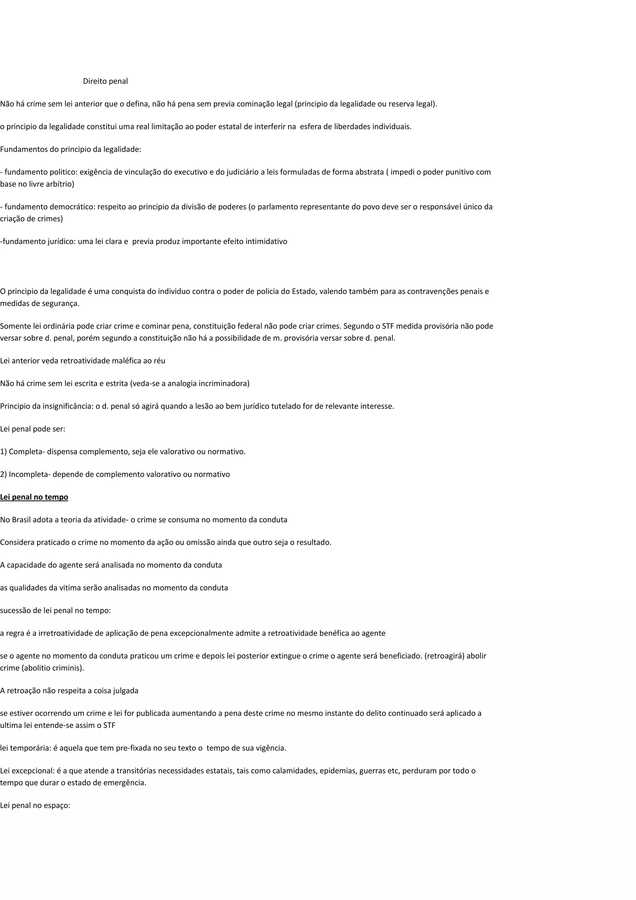 O documento discute os principais aspectos do Direito Penal brasileiro, como o princípio da legalidade, que estabelece que não há crime sem lei anterior que o defina. Apresenta também as teorias sobre a conduta dolosa e culposa, assim como as imunidades parlamentares e diplomáticas.