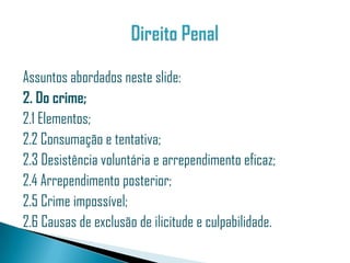 1. O documento aborda os conceitos jurídicos relacionados ao crime, incluindo sua definição sob diferentes aspectos, elementos constitutivos do crime, causação, tentativa, desistência voluntária e exclusão de ilicitude.