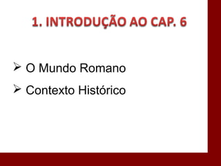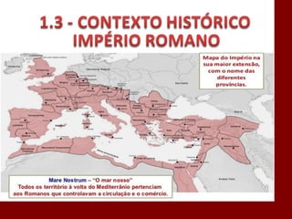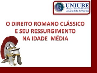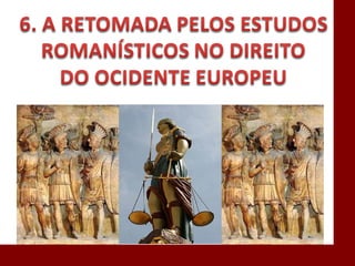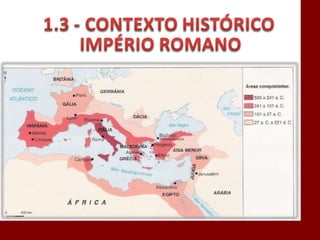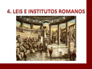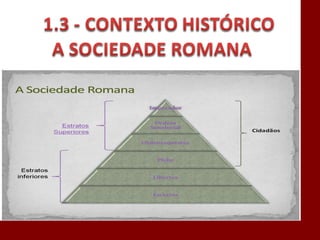 O documento descreve a história da civilização romana desde sua fundação por Rômulo em 753 a.C. até o declínio do Império Romano no século V d.C. Aborda a evolução da estrutura política de Roma, do período monárquico à república e ao império, bem como aspectos do direito romano como a propriedade e as obrigações. Também discute a influência do direito romano nos sistemas jurídicos modernos.