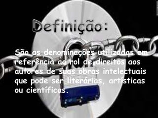 O documento discute os direitos autorais, que incluem direitos morais e patrimoniais dos autores sobre suas obras intelectuais. Os direitos morais são pessoais e inalienáveis e incluem a autoria e honra do autor. Os direitos patrimoniais dizem respeito à remuneração pelo uso comercial da obra. Plágio é apresentar a obra de outra pessoa como sua.
