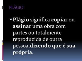Plágio significa copiar ou assinar uma obra com partes ou totalmente reproduzida de outra pessoa, dizendo que é sua própria. Direito autoral é um conjunto de prerrogativas conferidas por lei à pessoa física ou jurídica criadora da obra intelectual. O símbolo do copyright "©" é utilizado para indicar que a obra preserva todos os direitos do autor.