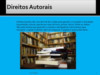Direitos autorais são leis que garantem a circulação e veiculação da produção cultural, protegendo artistas e autores ao assegurar o respeito à autoria das obras e permitindo a recuperação do capital investido através da distribuição das obras.
