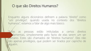 Os direitos humanos são direitos fundamentais que todas as pessoas possuem simplesmente por serem humanas, como o direito à vida e à segurança. Eles foram formalizados na Declaração Universal dos Direitos Humanos das Nações Unidas em 1948 para estabelecer uma compreensão comum sobre os direitos de todos, incluindo o direito de não ser torturado ou detido injustamente.