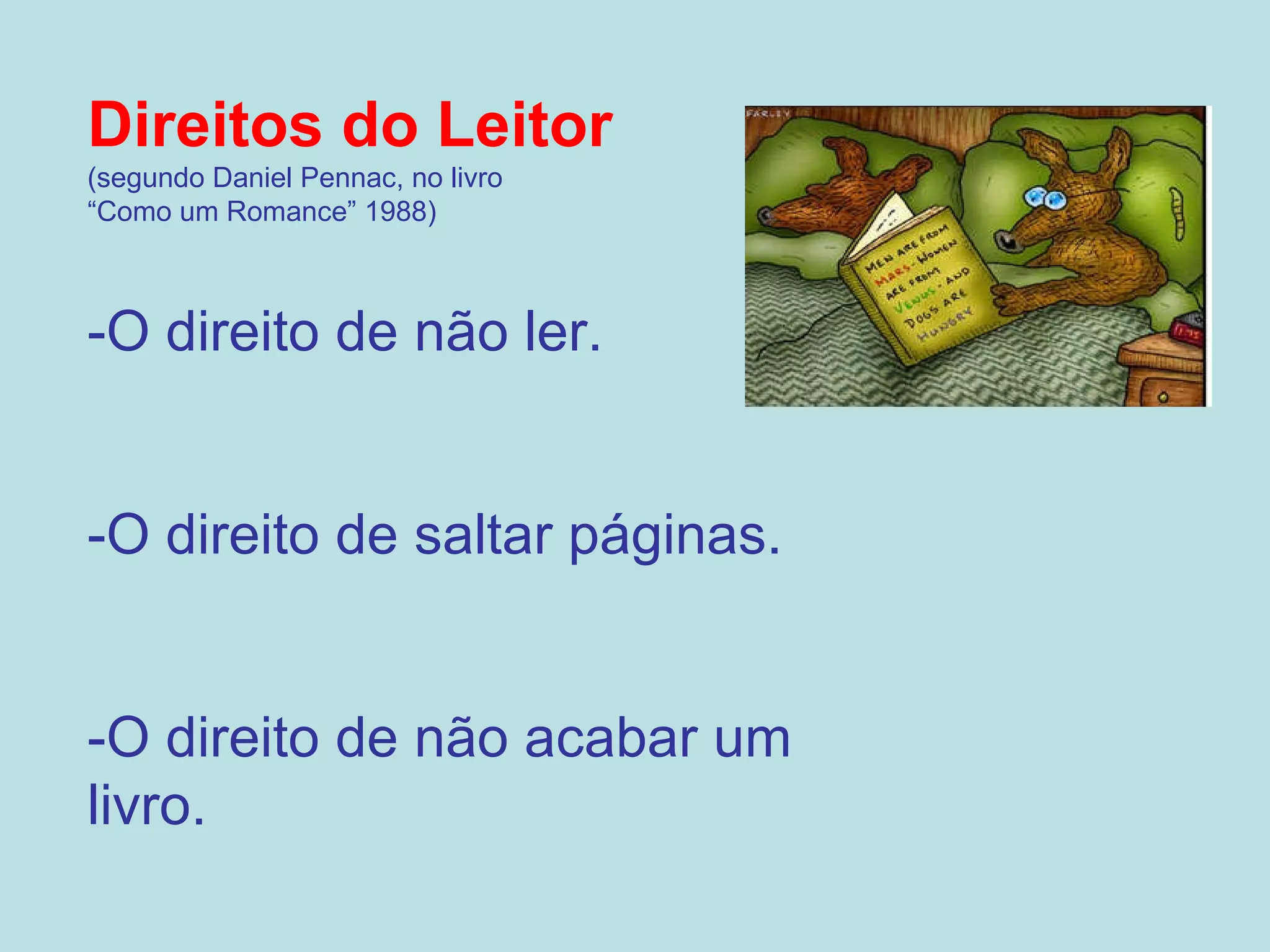 O documento lista os direitos que um leitor deve ter, como o direito de não ler, saltar páginas ou livros, não terminar um livro, reler, ler qualquer coisa e em qualquer lugar, amar heróis de romances, ler em voz alta ou não falar sobre o que leu. O documento enfatiza que ler deve ser um prazer.
