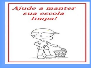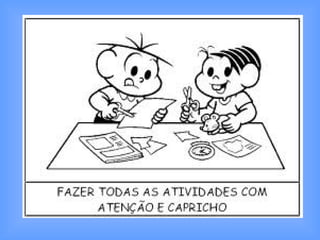 O documento lista os direitos e deveres de crianças na escola. Os direitos incluem ser respeitado, ter seus trabalhos avaliados, falar quando necessário, receber orientação para dificuldades e frequentar um ambiente limpo. Os deveres incluem respeitar todos, realizar atividades propostas, tratar todos com dignidade, escutar os outros, se esforçar para aprender, cumprir horários e zelar pela limpeza da escola.