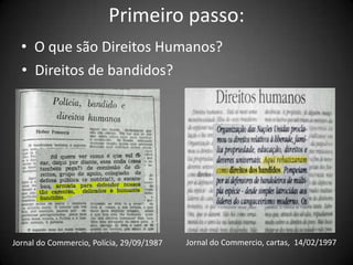 O documento discute a história e importância dos direitos humanos. Começa definindo direitos humanos e explicando que eles protegem valores essenciais para a dignidade humana. Detalha a evolução dos direitos humanos em três gerações, começando com limites ao poder do Estado e evoluindo para direitos econômicos e sociais. Também discute a defesa dos direitos humanos em Pernambuco por órgãos governamentais e não-governamentais.