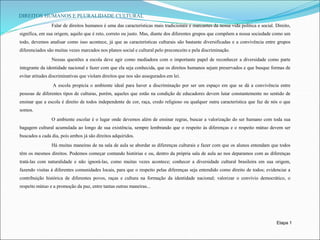 1) O documento discute a importância de se respeitar a diversidade cultural e os direitos humanos, especialmente no ambiente escolar.
