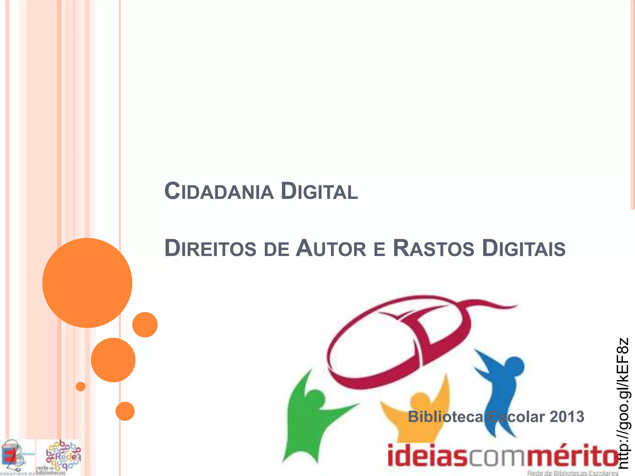 O documento discute direitos autorais e rastros digitais. Explica que direitos autorais protegem obras criativas como música, livros e filmes, dando ao proprietário controle sobre cópias e distribuição. Detalha o que é protegido, a duração dos direitos e como identificar obras protegidas. Também discute como respeitar direitos autorais e as implicações dos rastros digitais deixados online.