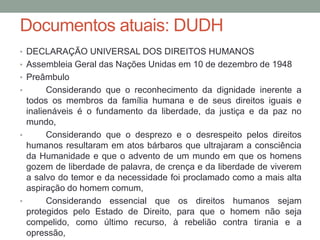 O documento descreve a estrutura e objetivos do sistema internacional de direitos humanos, incluindo a Declaração Universal dos Direitos Humanos de 1948 e outros tratados. Detalha também a estrutura da Organização das Nações Unidas, com seus principais órgãos como a Assembleia Geral, o Conselho de Segurança e o Conselho Econômico e Social.