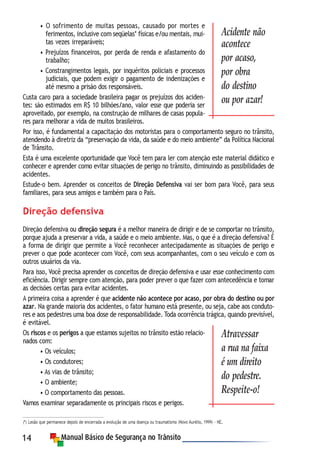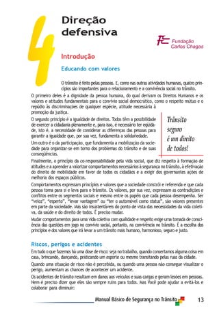O documento discute os princípios e valores importantes para uma convivência segura no trânsito, como dignidade humana, igualdade de direitos e participação. Também aborda os riscos e perigos no trânsito relacionados aos veículos, condutores, vias e comportamentos, enfatizando a importância da direção defensiva para prevenir acidentes.