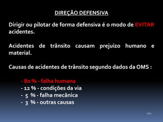 O documento discute direção defensiva, enfatizando que a maioria dos acidentes de trânsito são causados por falhas humanas que podem ser evitadas tomando cuidados básicos. A direção defensiva visa evitar acidentes ou diminuir suas consequências apesar de condições adversas ou erros de outros usuários das vias.