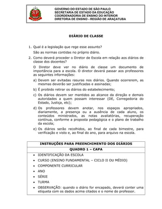 1) O documento fornece instruções sobre como preencher e manter diários de classe de acordo com a legislação educacional brasileira.