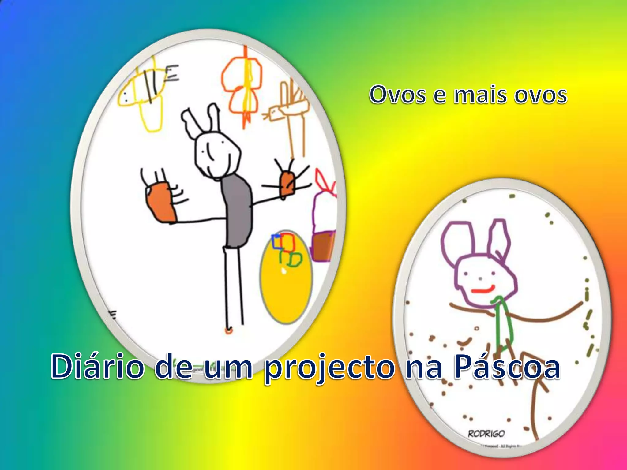 Os alunos aprenderam sobre ovos e a Páscoa ao longo de uma semana de projeto. Eles aprenderam que animais nascem de ovos, como galinhas e codornizes põem ovos. Experimentaram receitas como gemada e suspiros usando claras e gemas de ovos. Também fizeram atividades como contar e colorir ovos, recortar galinhas e pintar cestos para os ovos cozidos que levaram para casa no final da semana.