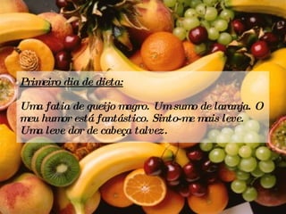 Primeiro dia dedieta: Uma fatia de queijo magro. Um sumo de laranja. O meu humor está fantástico. Sinto-me mais leve. Uma leve dor de cabeça talvez.