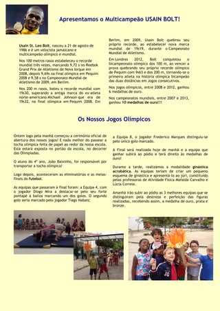 O documento apresenta o Diário Olímpico da escola D. Dinis, que descreve as atividades dos alunos no Centro de Atividades de Tempos Livres e fornece informações sobre grandes atletas olímpicos. O diário destaca a história do atleta português Carlos Lopes, que conquistou a medalha de prata em 1976 e a medalha de ouro em 1984. Também apresenta o atleta jamaicano Usain Bolt, recordista mundial dos 100 e 200 metros.