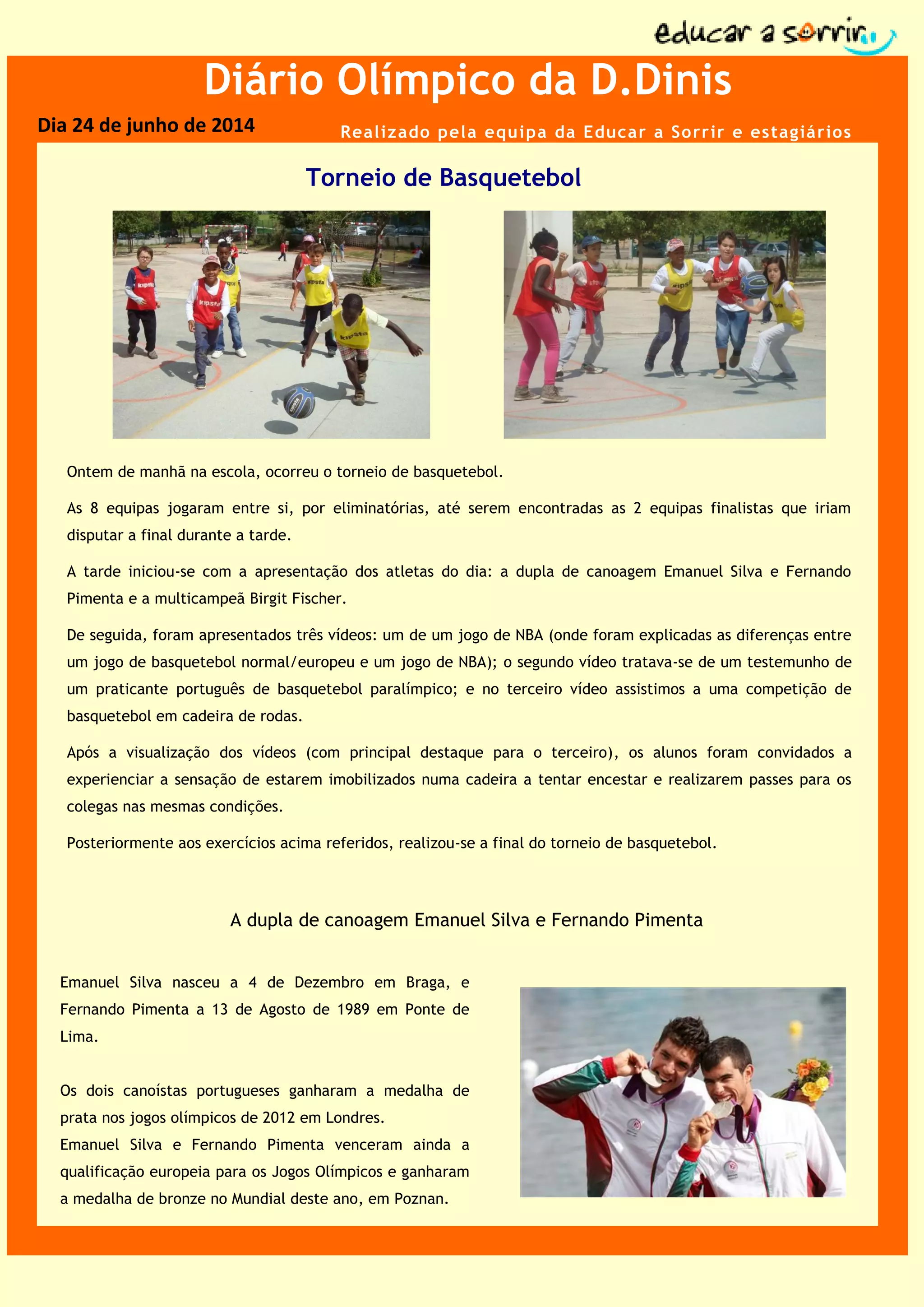 O documento descreve um torneio de basquetebol realizado em uma escola, incluindo as equipes finalistas e os vencedores. Também apresenta os atletas olímpicos portugueses de canoagem Emanuel Silva e Fernando Pimenta, assim como a multicampeã Birgit Fischer.