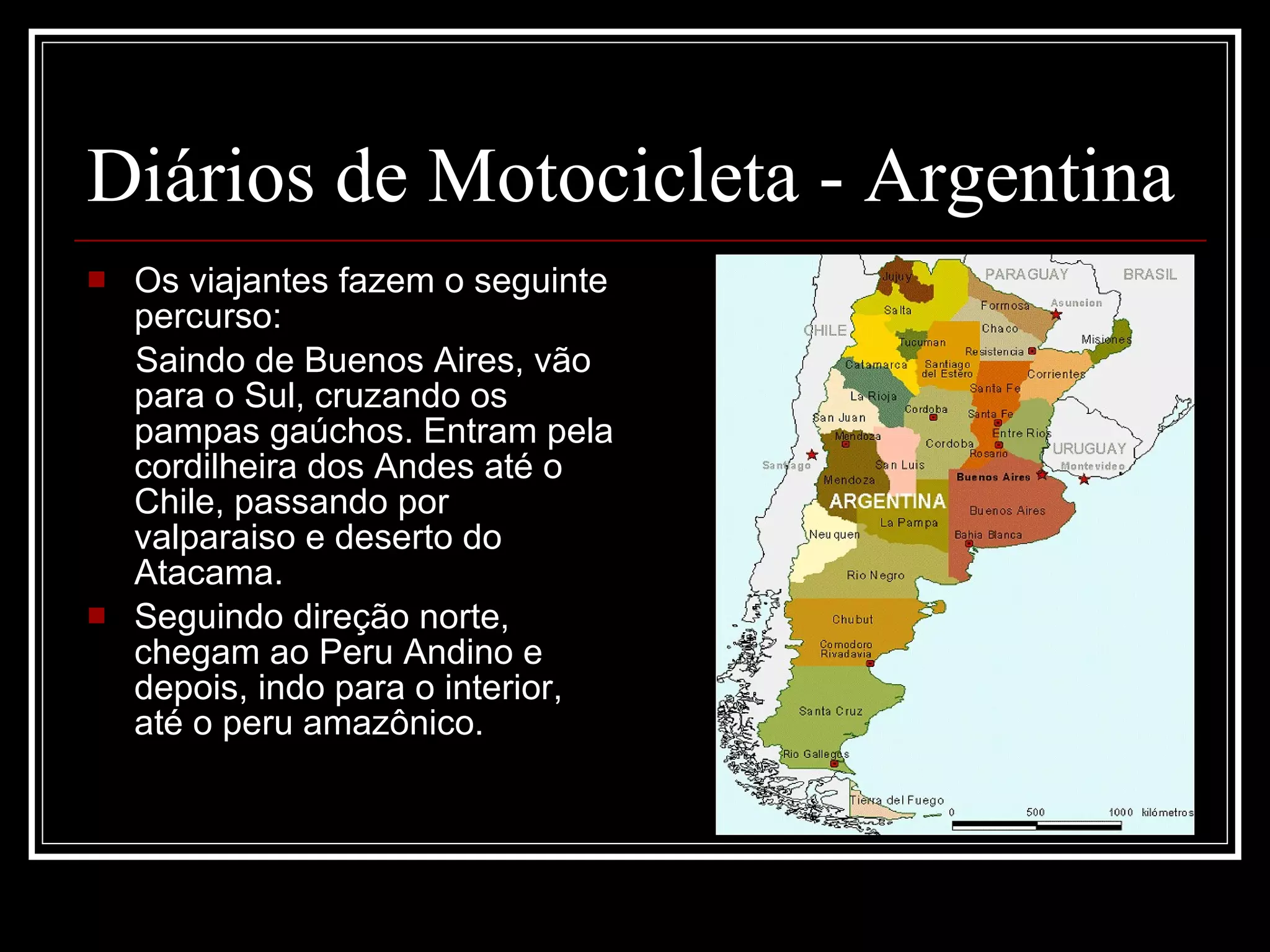 O documento descreve a viagem de motocicleta pelos países da América do Sul, começando pela Argentina, onde os viajantes atravessam os pampas até os Andes, e seguem para o Chile, Peru e de volta à Argentina. Detalha aspectos geográficos, econômicos e históricos desses países, incluindo a importância da agricultura e pecuária na Argentina, as diferenças entre o Chile e a Argentina, e o papel da mineração na economia peruana.