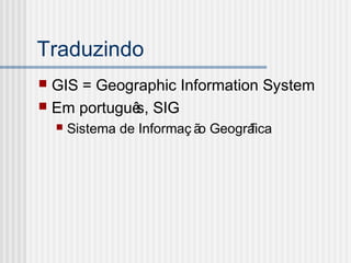 O documento fornece uma introdução sobre Sistemas de Informação Geográfica (SIG), explicando conceitos básicos como georreferenciamento, modelos vetoriais e raster, projeções cartográficas, armazenamento de dados espaciais e protocolos de acesso como WMS e WFS.