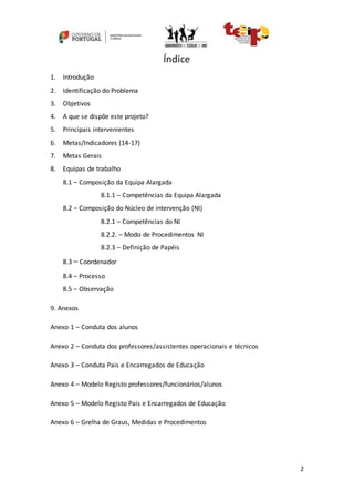Este documento apresenta um plano estratégico de prevenção e combate à indisciplina para 2014-2015. O plano cria um observatório para a indisciplina dividido em duas equipas e define regras e procedimentos dentro e fora da sala de aula. O objetivo é prevenir comportamentos de risco, intervir em situações de indisciplina e monitorizar os episódios de indisciplina através de várias atividades e medidas.