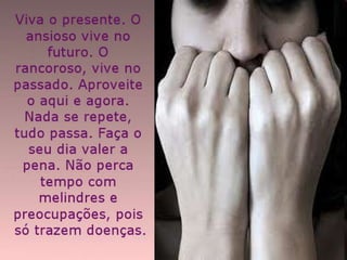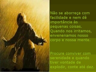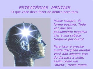 O documento discute estratégias mentais para o crescimento espiritual, enfatizando a importância dos pensamentos e emoções na evolução humana. Três pontos principais são: 1) os pensamentos positivos podem levar a obras maiores e ajudar no progresso espiritual; 2) as emoções e pensamentos definem como vivemos e influenciam nossa saúde e felicidade; 3) o autoconhecimento e domínio da mente são essenciais para viver em harmonia plena.