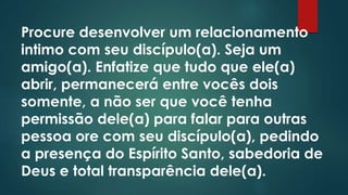 2) Ele enfatiza a importância de desenvolver um relacionamento íntimo e de confiança com o discípulo.