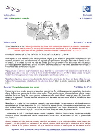 O documento fornece lições sobre discipulado e oração. Daniel 9 é analisado, mostrando como Daniel orava não por si mesmo, mas pela nação judaica e pela reputação de Deus. Jesus é dado como exemplo de constante oração, tanto pública quanto em privado. A oração é descrita como meio de nos unirmos a Deus e sermos transformados, não sendo algo egoísta.