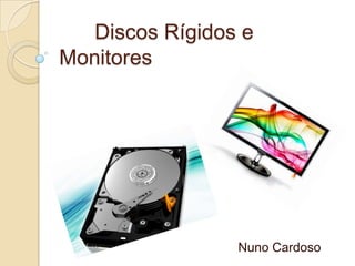 O documento descreve os principais tipos de discos rígidos e monitores, incluindo suas características e especificações. Discos rígidos armazenam dados de forma não volátil e expandem a memória RAM através da gestão de memória virtual. Os monitores transmitem informações visuais ao usuário e variam em tamanho de tela, tempo de resposta, cores e preço.