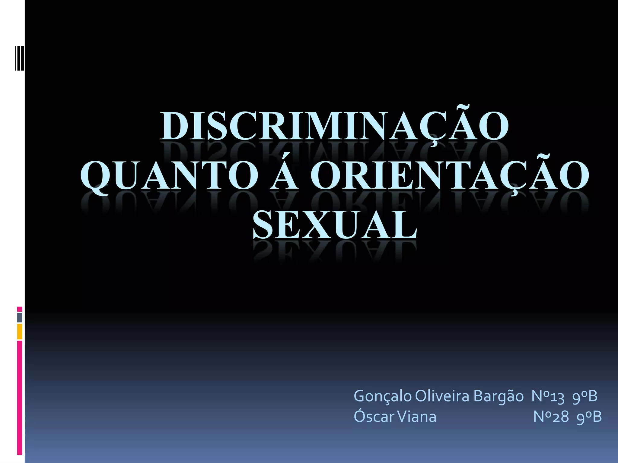 Este documento discute a discriminação quanto à orientação sexual. Apresenta definições de discriminação sexual e instituições de ajuda. Também aborda estereótipos, causas da discriminação, reconhecimento de direitos da comunidade LGBTQIA+, combate à discriminação e adoção por casais do mesmo sexo.