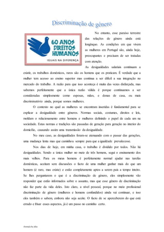 O documento descreve como as mulheres da família da autora tinham um estatuto social subordinado aos homens quando ela era criança, mas que as coisas começaram a mudar com o tempo à medida que as mulheres ganharam mais acesso à educação e empregos. A desigualdade de gênero ainda existe em algumas áreas, mas a autora observa melhorias nas gerações mais novas em sua própria família.