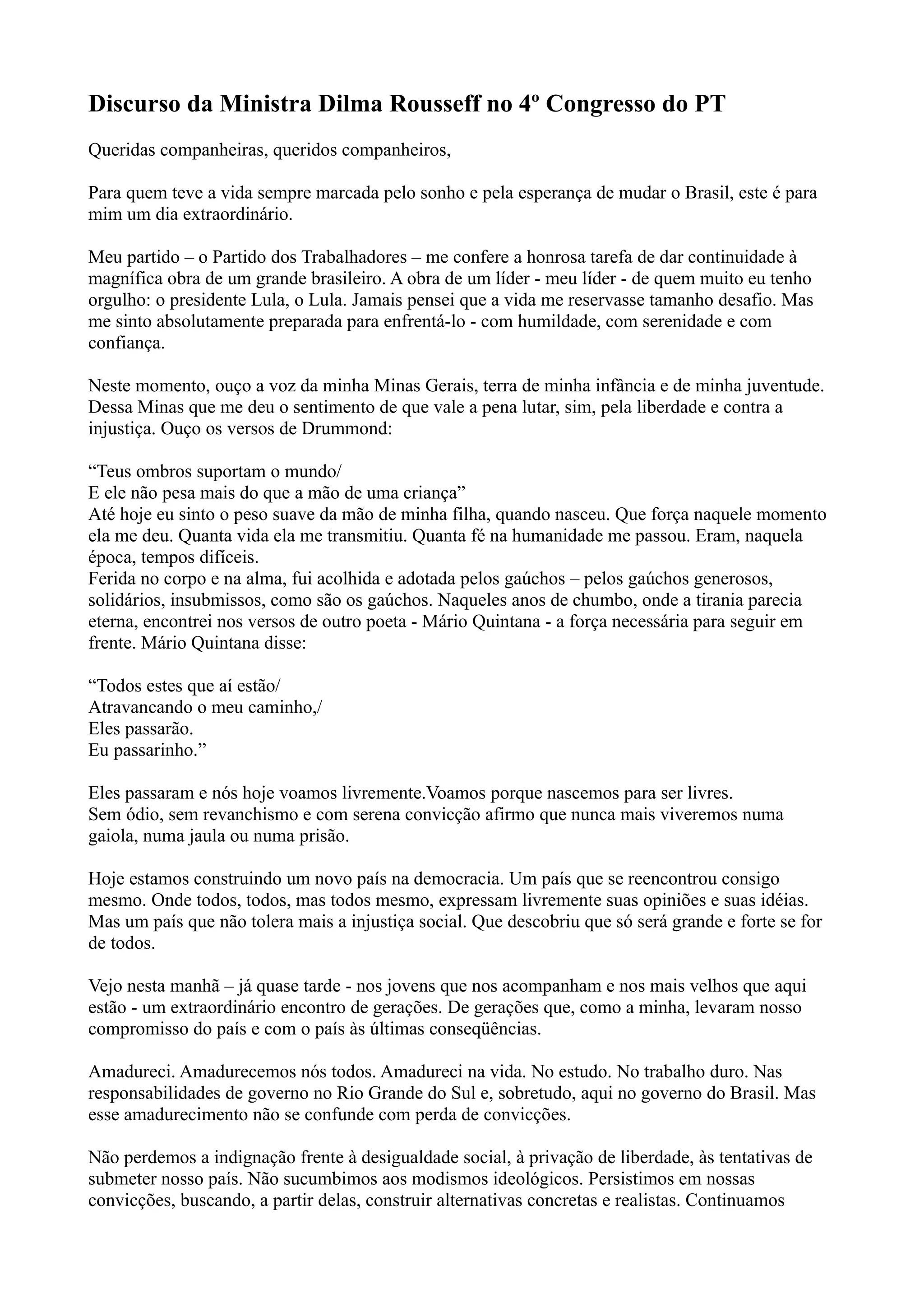 Dilma Rousseff discursa no 4o Congresso do PT agradecendo a confiança do partido em indicá-la como candidata à presidência. Ela destaca os avanços do país sob o governo Lula, como crescimento econômico com distribuição de renda, redução das desigualdades regionais, fortalecimento da democracia e do papel soberano do Brasil no mundo. Dilma afirma que dará continuidade a esses avanços com foco na justiça social.