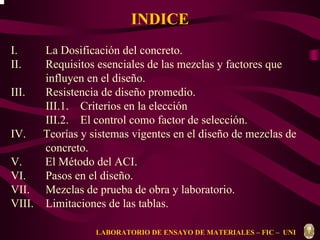 Este documento trata sobre la dosificación del concreto. Explica los principales métodos para el diseño de mezclas de concreto, incluyendo métodos basados en curvas teóricas y empíricas. También describe el método del Comité 211 ACI, el cual involucra 7 pasos como determinar las características de los materiales, calcular el tamaño nominal máximo y la resistencia de diseño promedio.