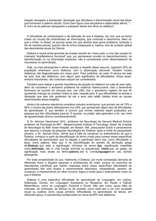 1) A compreensão da dislexia está diretamente ligada à compreensão do ser humano, da memória, do pensamento e da linguagem.
